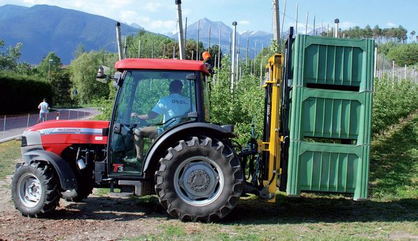 背負(fù)式叉車(chē) 是 為解決果園山地越野工況下 轉(zhuǎn)運(yùn)果筐和其它果園物資而研發(fā)的與果園拖拉機(jī)配合使用的果園轉(zhuǎn)運(yùn)裝備。叉車(chē)安裝在拖拉機(jī)后三點(diǎn)懸掛上,駕駛員通過(guò)操作液壓控制閥來(lái)控制叉車(chē)動(dòng)作,叉車(chē)具有舉升、側(cè)移、傾斜、鎖筐等功能,配備了舉升油缸2根、傾斜油缸1根、側(cè)移油缸1根、鎖緊油缸2根共計(jì)6根??梢淮闻e升多個(gè)果箱,方便果園果箱等物資的搬運(yùn),節(jié)省人力物力。果園用戶無(wú)需單獨(dú)購(gòu)買(mǎi)山地叉車(chē),把該背負(fù)式叉車(chē)直接安裝到拖拉機(jī)上即可實(shí)現(xiàn)山地搬運(yùn)作業(yè),拖拉機(jī)可到之處都可以使用。特別適合果園采摘后的果箱的轉(zhuǎn)運(yùn)工作。