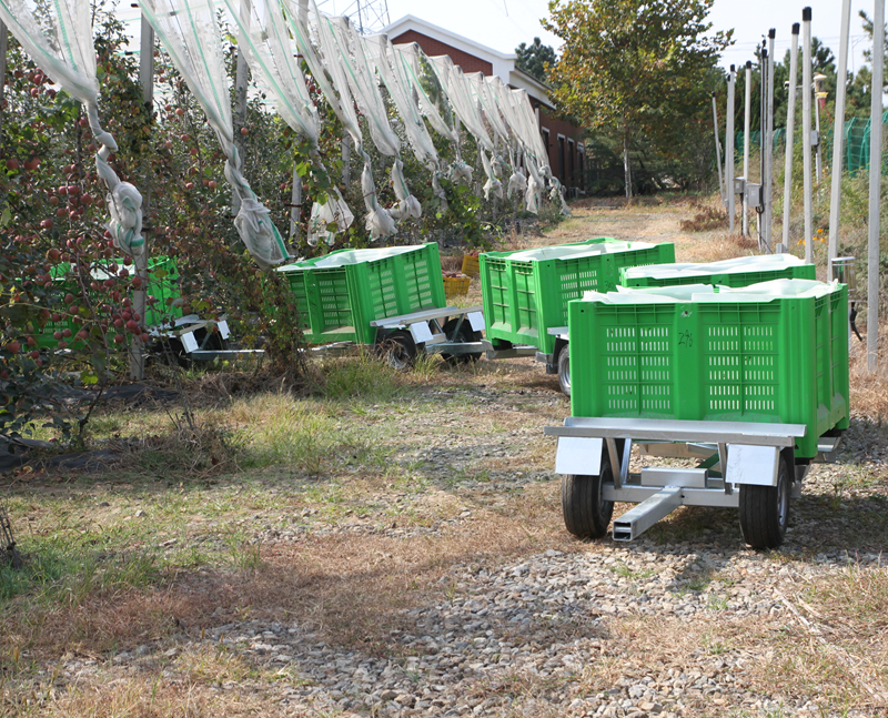 采摘列車是我司為提高現(xiàn)代化果園采摘運輸周轉(zhuǎn)效率、大幅減少果品碰壓傷而設(shè)計的果品運輸環(huán)節(jié)專用裝備。列車結(jié)構(gòu)設(shè)計簡潔堅固;整車采用熱浸鋅表面處理工藝,經(jīng)久耐用;果筐放置處設(shè)有4套經(jīng)過調(diào)校的果筐減震裝置,相比傳統(tǒng)運輸車能極大地減少果品運輸途中的損傷率,提高經(jīng)濟效益,可謂“小投入大收益”。列車輪胎采用高爾夫球車寬體輪胎,能有效減少坑洼路面對果品的顛簸。每4-6列為一個編組,每組列車帶有拖拉機牽引支架1件,存放收納支架1件,方便使用和存放。